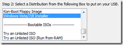 Next, under the Step 2: listing, you will need to select your first distribution to add to the USB drive. The YUMI software comes configured with several distributions, anything from standard Linux installation ISOs to specialty utilities. For this tutorial, we will simply be choosing a standard Windows 8 install: