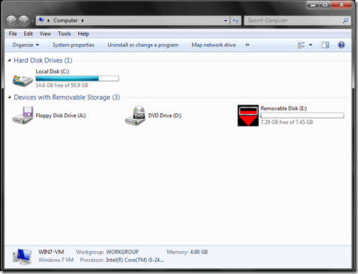 As described, the first step is to select the drive letter for your USB device. In Windows, you will usually want to select the E: drive, but this can differ depending on how you have your Windows drives structured. So, start by plugging in your USB drive to your computer and navigating the path Start > Computer. This will give you a view of all your active drives, in which you can simply determine the drive letter for your USB drive.