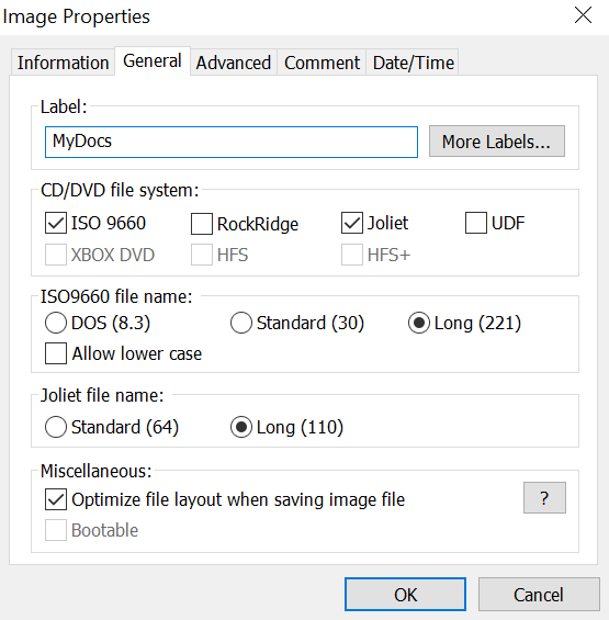 - If you want to specify any custom settings for your file, click on the Properties button at the top. It’ll then let you modify options like the file system for your ISO, file naming standard, compression level, and so on. Click on OK when you’ve configured them.