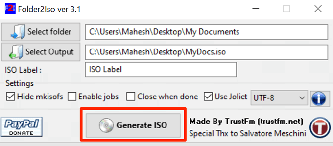 - Click on the **Generate ISO **button to make an ISO out of your chosen folders.
