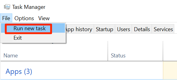 - Click on the File menu in Task Manager and select Run new task.