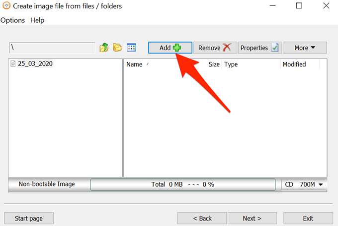 - The following screen will let you choose the folders that you want to add to your ISO. Click on the Add button at the top to add your folders.