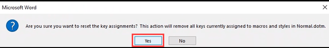 - It will ask, **Are you sure you want to reset the key assignments? This action will remove all keys currently assigned to macros and styles in Normal.dotm**. Note that at the end of that warning, it will read either Normal.dotm or the document you’ve selected. Select **Yes **to confirm the reset.