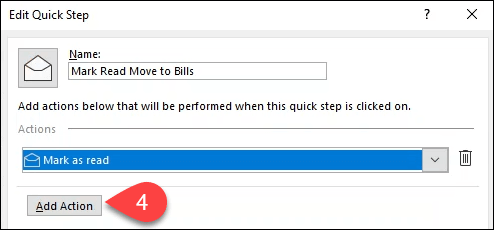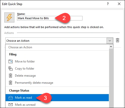 - The **Edit Quick Step **window will open. Enter a descriptive name in the **Name** field. * Choose from one of the predefined actions in the **Choose an Action **drop-down menu. In this example, let’s go with **Mark as read**.
