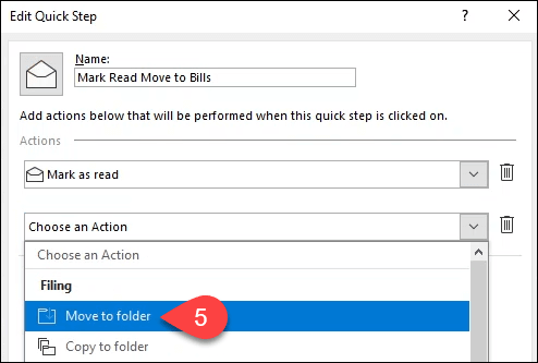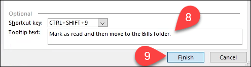 - Select **Finish **to complete creating the Quick Step. You’ll now see the **Mark Read Move to Bills** Quick Step in the Outlook ribbon. Test it using the shortcut key combo you chose in step 7.