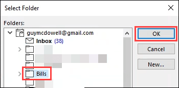 - The **Select Folder **window will open. Find and select the folder to which you want this Quick Action to move the email. We select the folder **Bills **for this example. Select **OK **to close the window.