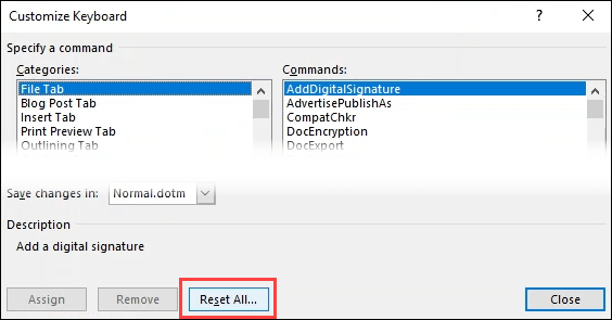 - To remove the key assignments from all future documents, leave **Normal.dotm **selected in the **Save changes in **drop-down. To remove them only from this document, choose the document in the dropdown instead. Near the bottom-left, select the **Reset All **button.
