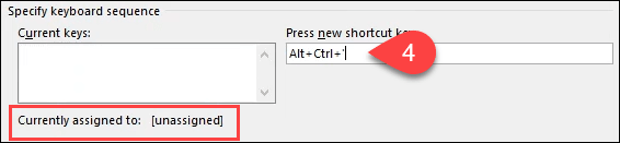 - To set a new shortcut key combination, place the cursor in the **Press new shortcut key** field, then press the key combo you want to use on your keyboard. Make a note of what shows under the **Current keys** area next to **Currently assigned to**. If anything but **[unassigned]** shows there, try another key combo.