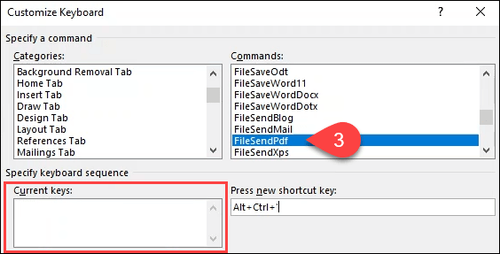 - The **Customize Keyboard** window will open. Look in the **Categories **area to narrow down to a tab which has the command you want to create a shortcut for. That tab’s commands will show in the **Commands **area on the right. Select the command you want. In this example, we’ve selected **FileSendPdf**, as it would be very helpful to send a Word document as a PDF with a simple keystroke combination. If the command already has a keyboard combo, it will show in the **Current keys **area.
