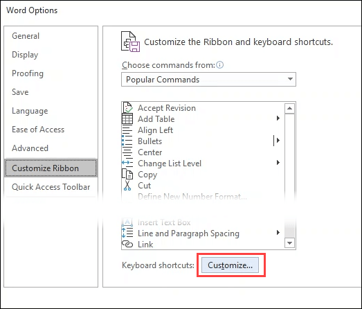 - The **Word Options **window will open. Select **Customize **next to **Keyboard shortcuts** near the bottom of the window.
