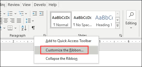 - Right-click on any grey space in the ribbon area and select Customize the Ribbon.