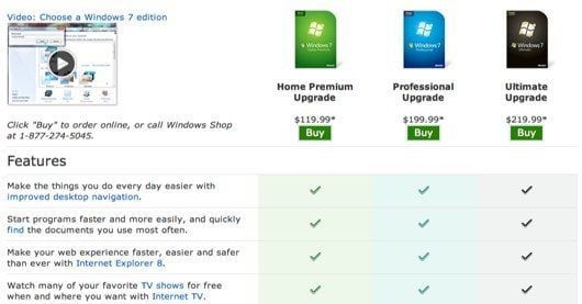 I find their comparison a bit too simplified and not very clear cut, especially if you want to know all the extra features of each version. This chart just goes over some very basic points, most of which are useless like “improved desktop navigation” and “Internet Explorer 8”.