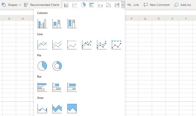 Microsoft Excel online does have a selection of charts, but they are very basic. You’ll find 2D column, line, pie, bar, and area charts.