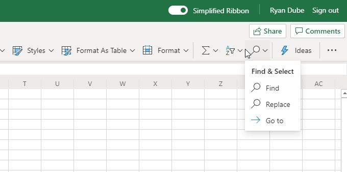 - Most of the Find & Select menu is missing (formulas, notes, constants, and more).