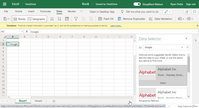 Even with all of those Data menu features missing, it is good at least that Microsoft Excel online does provide the ability to bring in stock and geography data sources from the internet.