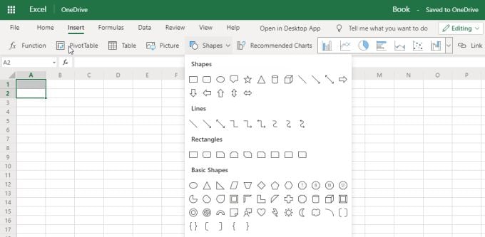 The Insert menu also looks pretty basic in the Excel online version, but again this is because most of the advanced features are buried in submenus.