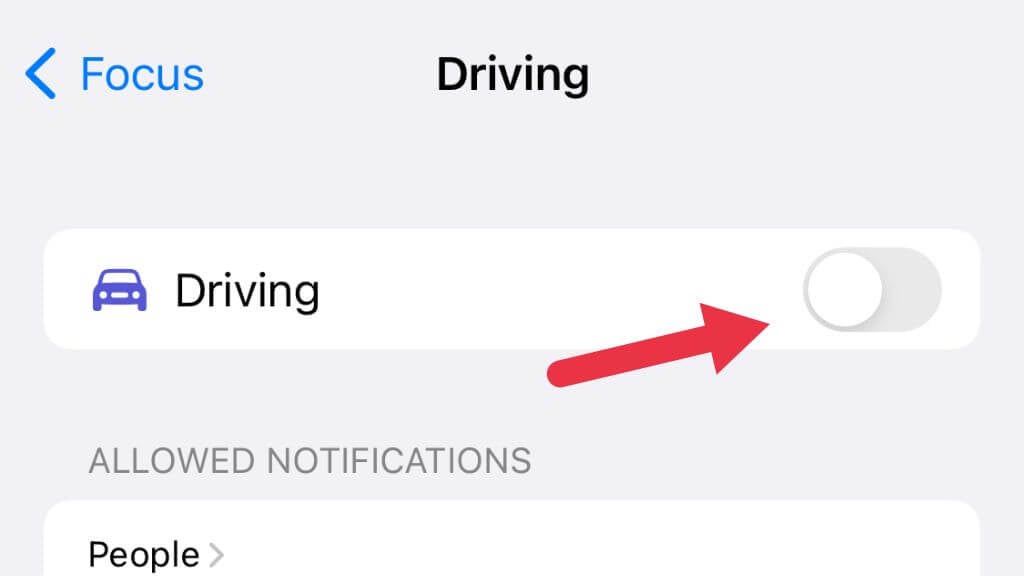 You can turn off focus mode while driving, by tapping the toggle. Alternatively, you can change the setting under Turn On Automatically to When Connected to Car Bluetooth or Manually.