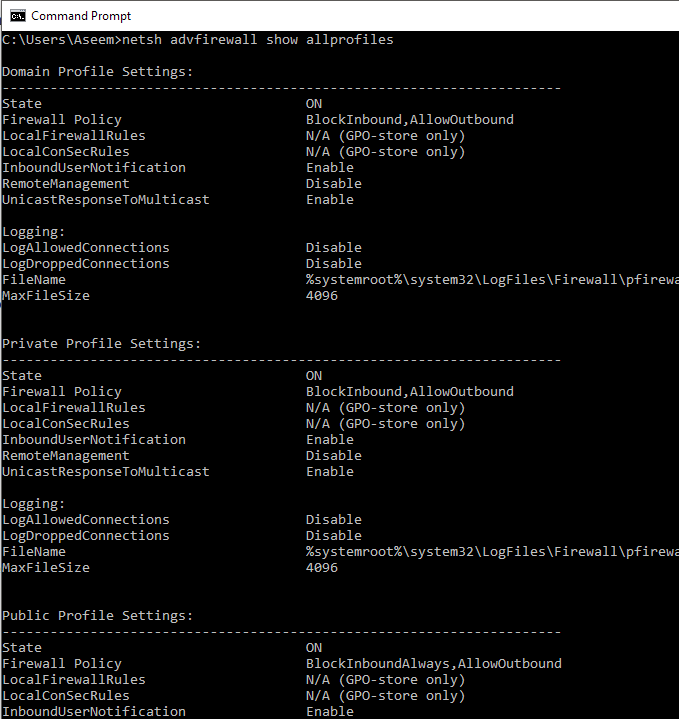 First, to see whether the Windows Firewall is enabled on a server or computer, type this command at the command prompt: netsh advfirewall show allprofiles