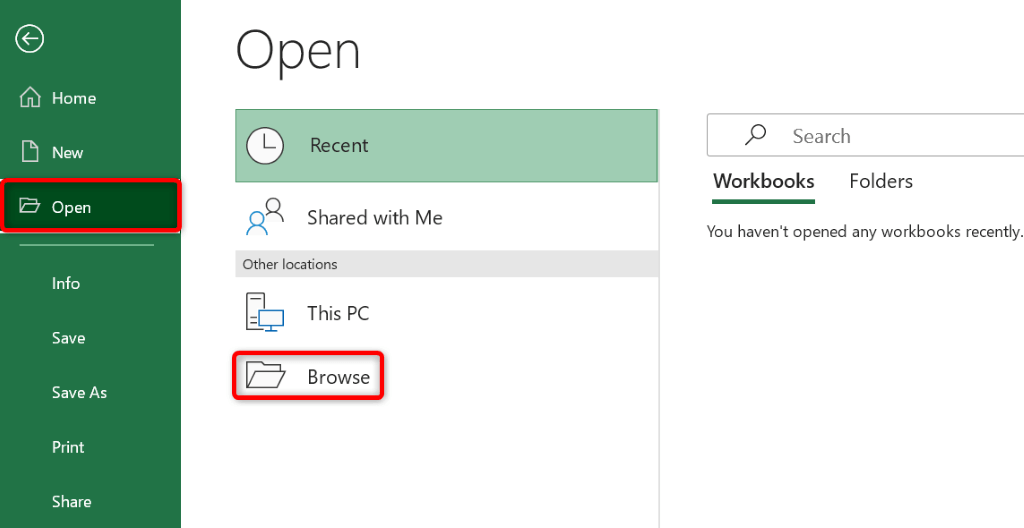 - Launch Excel, select Open on the left, and choose Browse in the middle column.