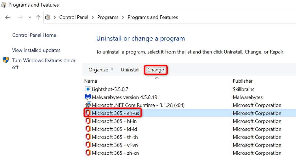 - Choose your Microsoft Office installation on the list and select Change at the top.