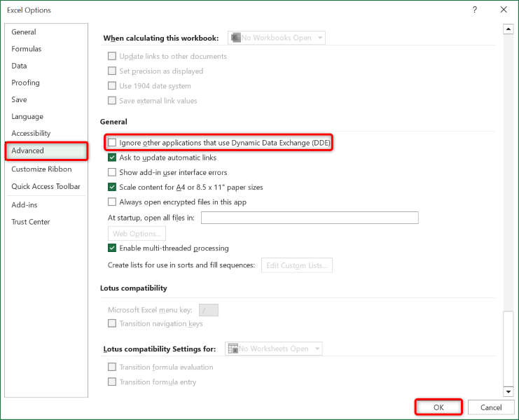 2. Uncheck Excel’s Dynamic Data Exchange (DDE) Option