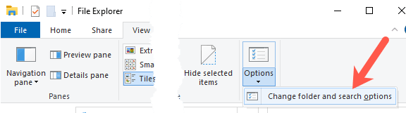 To do so, navigate to File Explorer Options in your Control Panel. You can do this by opening explorer, clicking on the View tab and then clicking on the Options drop down. Here, click on Change folder and search options.
