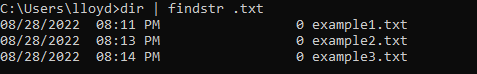 This runs a findstr search on the output of the dir command, returning the file list ending with .txt. Of course, this particular example is useless in practice since dir can already locate files of the same type with a regular expression.