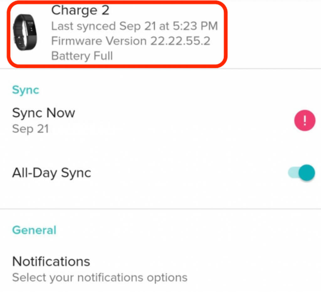 - Next, tap the **Settings** (**gear)** icon and check below the name of your Fitbit device to see when it **last synced** with your smartphone. Here, you can also find information about your Fitbit device’s battery level and firmware version.