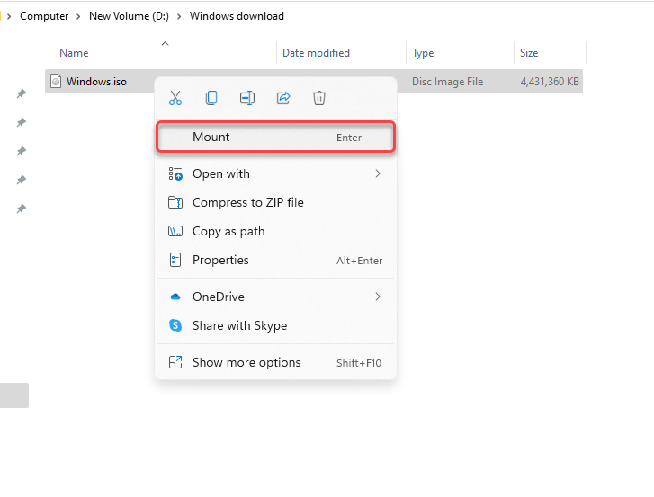 You can clean install Windows without creating bootable media. If you don’t want to create a DVD or USB installation drive, you can simply mount the ISO using the built-in mounting feature. Simply right-click on the ISO file and select Mount.