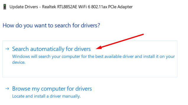 - The driver update Window will open and ask you how you want to install the driver. Choose the Search for drivers automatically option and follow the instructions.