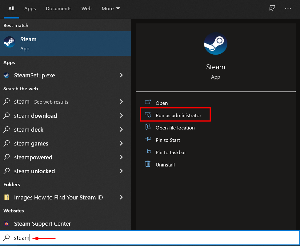 Find the Steam client’s shortcut, right-click it and select the Run as Administrator option. If you don’t have a desktop shortcut, you can locate the client by typing “Steam” in the Windows search field.