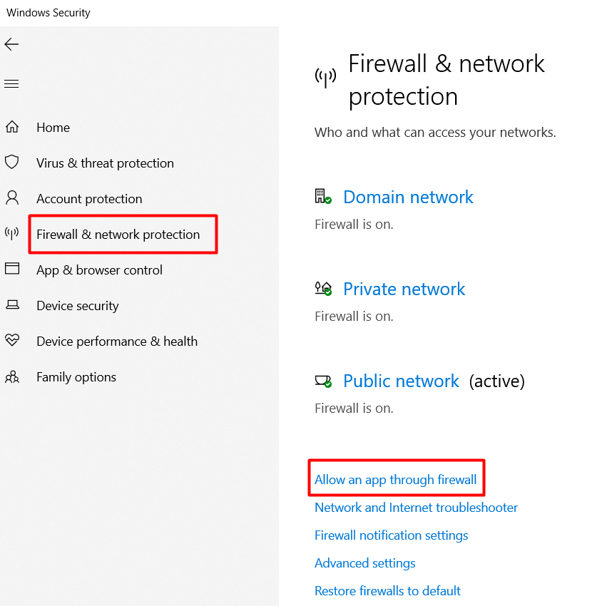 In the left panel, click on Firewall & network protection and then select the Allow an app through firewall option in the right panel.