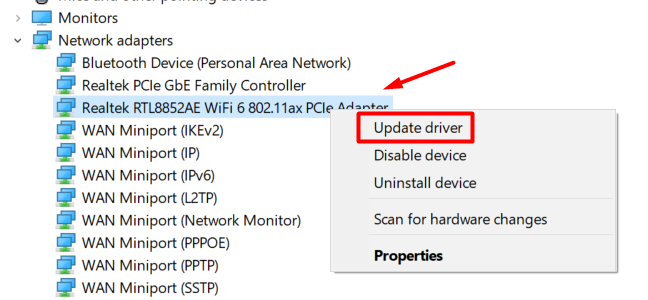 Select the network adapter you want to update, right-click it, and choose Update driver from the menu.