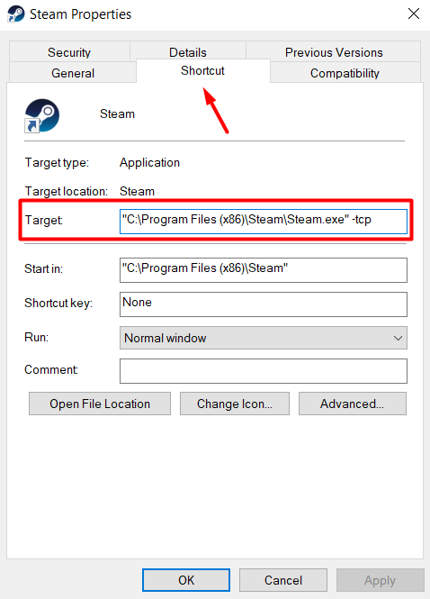 - Go to the Shortcut tab and edit the Target text by adding -tcp at the end.