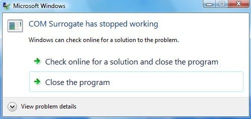 A client of mine started having a strange problem when browsing pictures and videos on his Windows 7 PC: it would popup with the following error message: COM Surrogate has stopped working