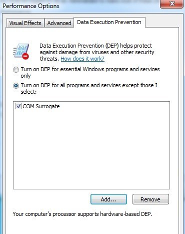 Another fix that has been mentioned numerous times is adding dllhost.exe to the exclusion list for DEP (Data Execution Protection). You can read my previous post on how to turn off DEP in Windows. On the last step in that article, click Add and then add the following exe file in Windows 7 32-bit: C:\Windows\System32\dllhost.exe