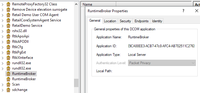 Right-click on each of them and choose Properties. On the General tab, you’ll see Application ID, which should match the AppID from the error message. If you are getting errors in Event Viewer with an ID of 10016 and more than one CLSID, then it could be that both RuntimeBrokers need to be fixed. In my case, I only had to fix one. ## Step 4 – Correct Permissions