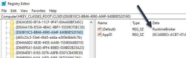 After some time, you should get a result under the HK_CLASSES_ROOT\CLSID key. On the right-hand side, it should have two keys and the Default one should list out the name of the service. In my case and probably yours also, it should be RuntimeBroker.