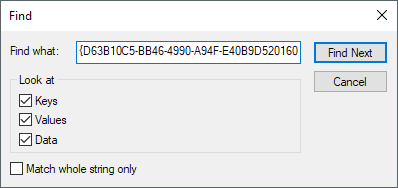 Now you need to open the registry editor by clicking on start and typing in regedit. When you have the registry editor opened, click on Edit and then Find. Go ahead and paste the CLSID into the search box and press Enter.