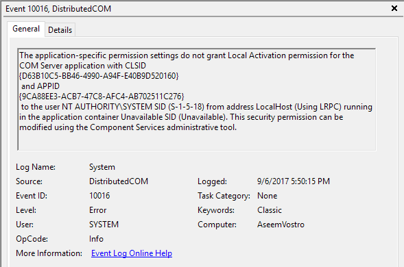 However, it’s still fun and you get to learn a lot. In this article, I’m talking about fixing the error that shows up in Event Viewer related to DistributedCOM. I noticed I had no other errors in my System log other than a few every day with an Event ID of 10016. The basic error message was the same: The application-specific permission settings do not grant Local Activation permission for the COM Server application