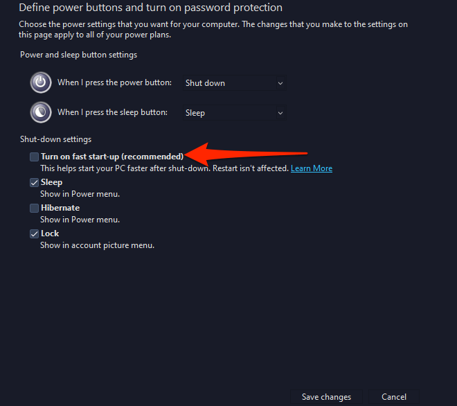 - On the next screen, at the top, select the **Change settings that are currently unavailable** option. * From the **Shutdown settings** section on the same screen, disable the **Turn on fast startup (recommended)** option. * Select **Save changes** at the bottom.