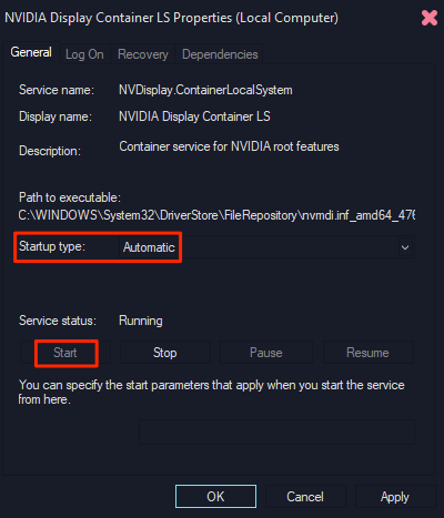 - Then, select **Apply** followed by **OK** at the bottom to save your changes. * Repeat steps **4**, **5**, and **6** for the service named **NVIDIA LocalSystem Container**.