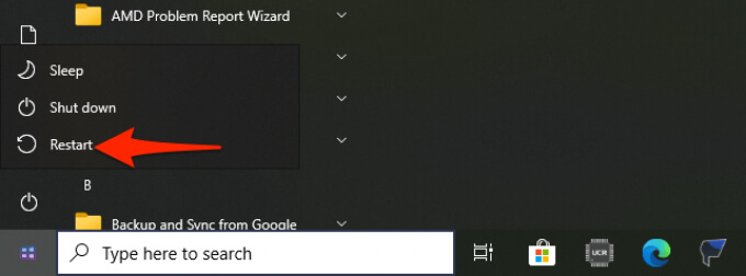 On a Windows 10 PC, the easiest way to fix most minor issues is by restarting your PC. When you do this, many temporary items on your PC get reset. This gives a fresh chance to your programs to load from scratch.
