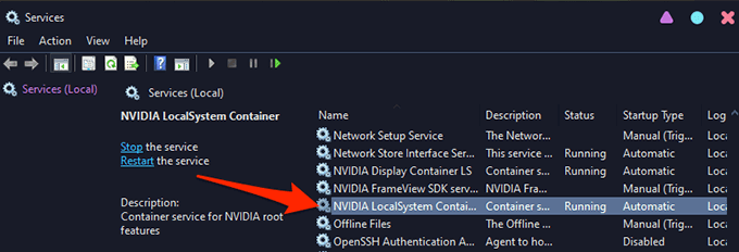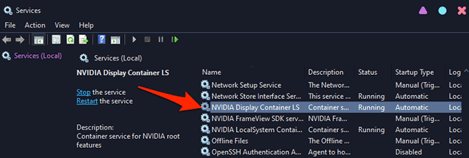 - The **Services** window will open. Here, in the pane on the right, find the service that says **NVIDIA Display Container LS** and double-click it.