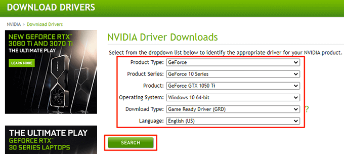 - When your drivers are removed, launch a web browser on your PC and head to the Nvidia drivers website. * On the site, use the dropdown menus to choose your particular graphics card model. Then, select **Search**.