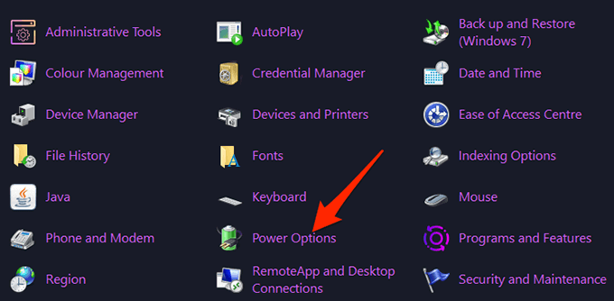 - Select the **View by** option at the top and choose **Large icons**. * Select **Power Options** from the options displayed on your screen.