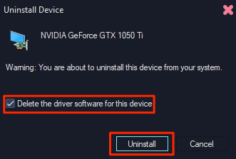 - In the Uninstall Device window, enable the **Delete the driver software for this device** box and select **Uninstall**.
