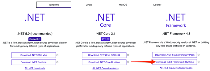 - From under the .NET Framework section, select the Download .NET Framework Runtime option.