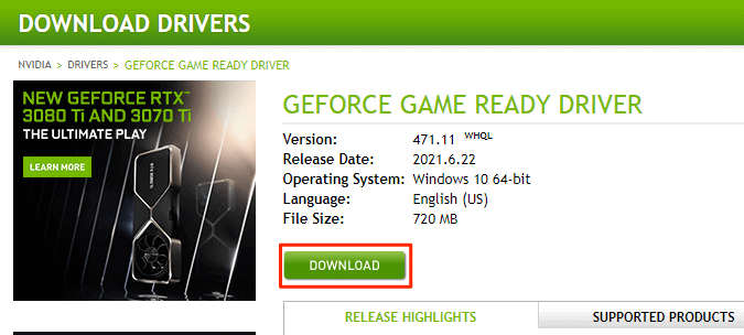 To fix the issue in this case, remove the existing drivers from your PC and reinstall the latest and working drivers. You can grab the latest drivers for your specific graphics card model for free from the Nvidia website.