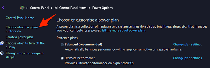 - From the sidebar on the left, select **Choose what the power buttons do**.